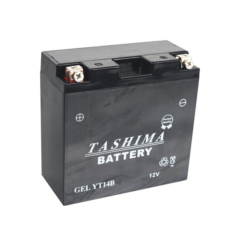 Batterie YT14BBS + à gauche (livrée avec électrolyte)
