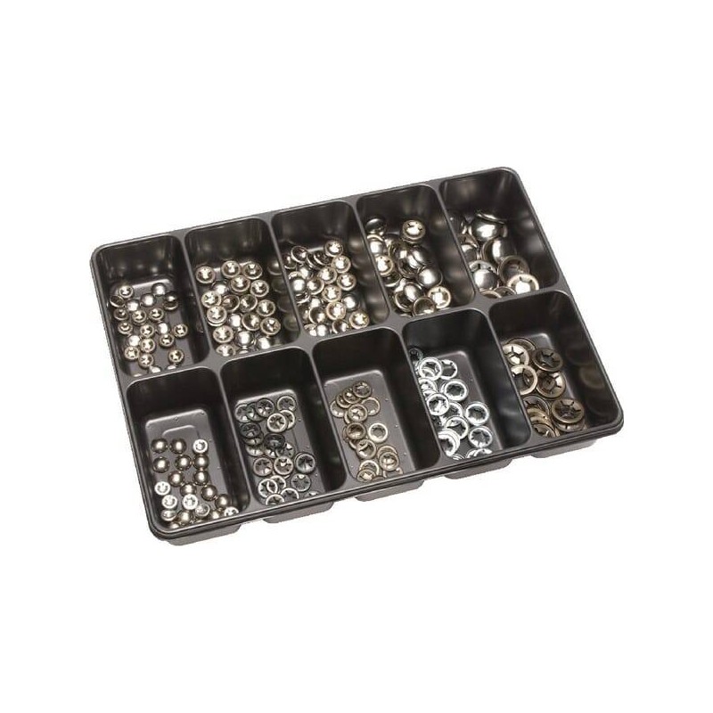 Composition : Circlips Starlock avec cache: 25 x diamètre 5 mm 25 x diamètre 6 mm 25 x diamètre 8 mm 25 x diamètre 10 mm 15 x diamètre 12 mm Circlips Starlock: 25 x diamètre 5 mm 25 x diamètre 6 mm 25 x diamètre 8 mm 25 x diamètre 10 mm 15 x diamètre 12 mm